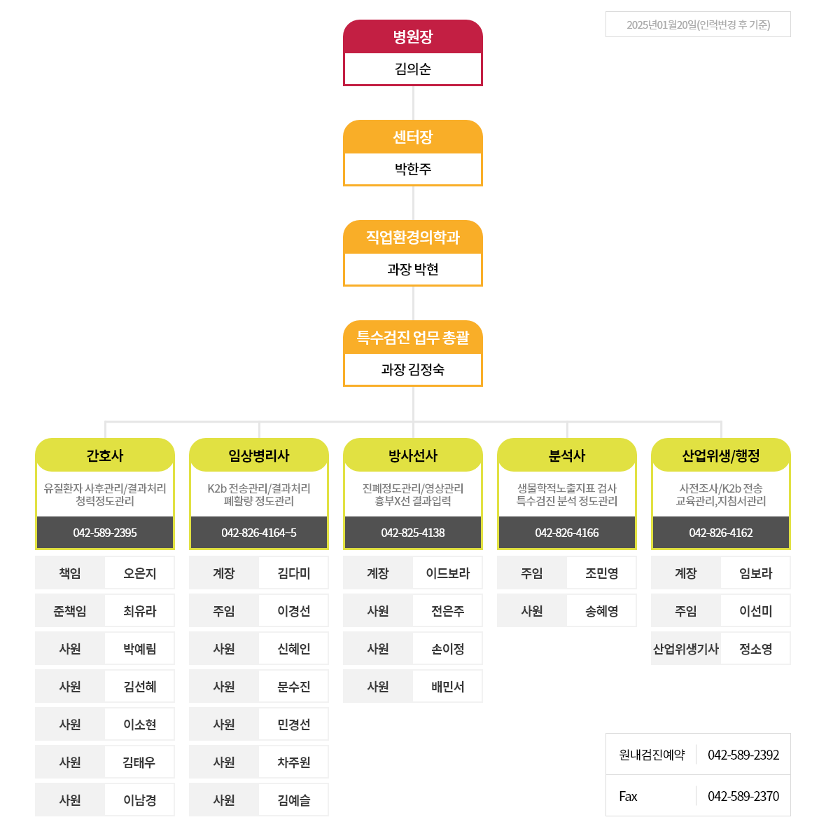 | 13 | 김다미 | 임상병리사 | . 폐활량정도관리 전담(정) . 생물학적 노출지표검사 지침서 관리 . K2b 전송관리 . 특수건강진단 폐활량 검사 | 육아휴직중 |